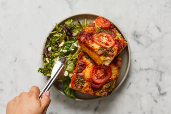 • Once dough has rested 30 minutes, drizzle olive oil over the top of dough. Gently press your fingertips into dough to create divots. • Evenly sprinkle dough with mozzarella cheese. Dollop marinara and pesto over cheese. Sprinkle with diced salami and top with tomato. Season with salt and pepper. • Transfer to oven and bake on middle rack until top and sides are golden brown, puffed, and cooked through, 25-30 minutes.